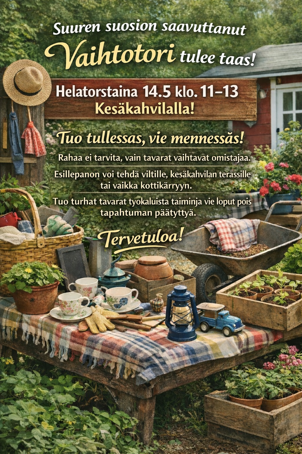 Kevät on täydellinen aika laittaa tavarat kiertoon ja löytää uusia aarteita! 🌸☀️ Voit tuoda esimerkiksi: 🌱 taimia 🛠 työkaluja 🏡 mökkitavaroita 🧺 kodin ja puutarhan käyttöesineitä Tule tekemään…